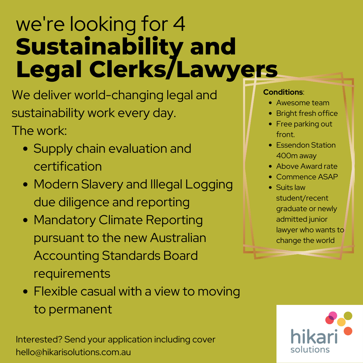 Hikari Solutions is Australasia's only bespoke sustainability consultancy and legal practice, combining legal advice and advisory services. This combination provides our clients with the best possible assurance. We specialise in Illegal Logging legislation compliance, reporting under the Modern Slavery Act and general commercial work for clients including Employment or OHS law. We also offer clients assistance with the new climate related financial disclosures requirements. Hikari Solutions is a specialist firm which serves a large number of small to medium business clients. We exist to ensure companies are positioned to act responsibly. We believe ‘Better is Possible’ in all aspects of corporate social responsibility.